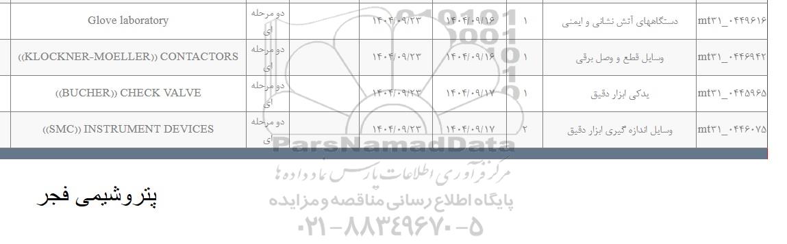 | mt31-0446075 | وسایل اندازه گیری ابزار دقیق | 2 | 1404.9.17 | 1404.9.23 | دو مرحله ای | ((SMC)) INSTRUMENT DEVICES |