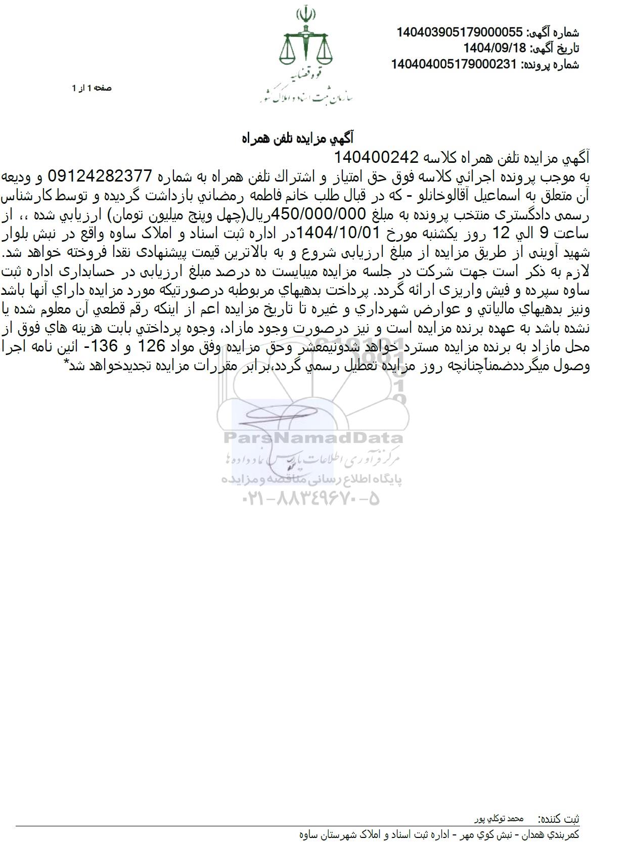 به موجب پرونده اجرائي كلاسه فوق حق امتياز و اشتراک تلفن همراه به شماره 09124282377 و ودیعه آن متعلق به اسماعیل آقالو خانلو - که در قبال طلب خانم فاطمه رمضانی بازداشت گردیده و توسط کارشناس رسمی دادگستری منتخب پرونده به مبلغ 450.000.000 ریال (چهل و پنج میلیون تومان) ارزیابی شده ،، از ساعت 9 الی 12 روز یکشنبه مورخ 1404.10.1 در اداره ثبت اسناد و املاک ساوه واقع در نبش بلوار شهید آوینی از طریق مزایده از مبلغ ارزیابی شروع و به بالاترین قیمت پیشنهادی نقدا فروخته خواهد شد. لازم به ذکر است جهت شرکت در جلسه مزایده میبایست ده درصد مبلغ ارزیابی در حسابداری اداره ثبت ساوه سپرده و فیش واریزی ارائه گردد. پرداخت بدهیهای مربوط به در صورتیکه مورد مزایده دارای آنها باشد ونيز بدهيهای مالياتی و عوارض شهرداری و غیره تا تاریخ مزایده اعم از اینکه رقم قطعی آن معلوم شده یا نشده باشد به عهده برنده مزایده است و نیز در صورت وجود مازاد وجوه پرداختی بابت هزینه های فوق از محل مازاد به برنده مزایده مسترد خواهد شد و نیمعشر وحق مزایده وفق مواد 126 و 136 آئین نامه اجرا وصول میگردد ضمنا چنانچه روز مزایده تعطیل رسمی گردد برابر مقررات مزایده تجدید خواهد شد.