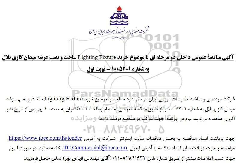 آگهی مناقصه عمومی داخلی دو مرحله ای با موضوع خرید Lighting Fixture ساخت و نصب عرشه میدان گازی بلال به شماره 1005201 - نوبت اول