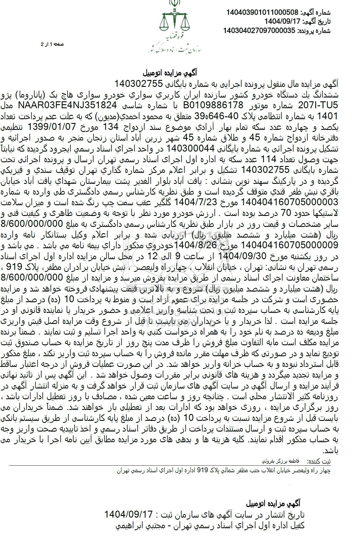 آگهی مزایده مال منقول پرونده اجرایی به شماره بایگانی 140302755 ششدانگ یک دستگاه خودرو کشور سازنده ایران کاربری سواری خودرو سواری هاچ بک (پاناروما) پژو مدل NAAR03FE4NJ351824 با شماره شاسی B0109886178 2071 شماره موتور-T5 1401 به شماره انتظامی پلاک 40-390646 متعلق به محمود احمدی (مدیون) که به علت عدم پرداخت تعداد یکصد و چهارده عدد سکه تمام بهار آزادی موضوع سند ازدواج 134 مورخ 1399.01.07 تنظیمی دفترخانه ازدواج شماره 45 و طلاق شماره 45 شهر زرین آباد استان زنجان منجر به صدور اجرائیه و تشکیل پرونده اجرائی به شماره بایگانی 140300044 در واحد اجرای اسناد رسمی ایجرود گردیده که نیابتا جهت وصول تعداد 114 عدد سکه به اداره اول اجرای اسناد رسمی تهران ارسال و پرونده اجرائی تحت شماره بایگانی 140302755 تشکیل و برابر اعلام مرکز شماره گذاری تهران توقیف سندی و فیزیکی گردیده و در پارکینگ سهند نوین بنشانی : یافت آباد بلوار الغدیر پشت بیمارستان شهدای یافت آباد خیابان باقری نبش ظفر قندی متوقف گردیده است و طبق نظریه کارشناس رسمی دادگستری طی وارده به شماره 140404160705000003 مورخ 1404.7.23 گلگیر عقب سمت چپ رنگ شده است و میزان سلامت لاستیکها حدود 70 درصد بوده است. ارزش خودرو مورد نظر با توجه به وضعیت ظاهری و کیفیت فنی و سایر مشخصات و قیمت روز در بازار طبق نظریه کارشناس رسمی دادگستری به مبلغ 8.600.000.000 ریال هشت میلیارد و ششصد میلیون ریال ارزیابی شده و برابر اعلام وکیل بستانکار نامه وارده 140404160705000009 مورخ 1404.8.26 خودروی مذکور دارای بیمه نامه می باشد . می باشد و در روز یکشنبه مورخ 1404.09.30 از ساعت 9 الی 12 در محل سالن مزایده اداره اول اجرای اسناد رسمی تهران به نشانی تهران، خیابان انقلاب ، چهار راه ولیعصر ، نبش خیابان برادران مظفر، پلاک 919 ، ساختمان معاونت اجرای اسناد رسمی از طریق مزایده بفروش میرسد و مزایده از مبلغ 8.600.000.000 ریال هشت میلیارد و ششصد میلیون ریال شروع و به بالاترین قیمت پیشنهادی فروخته خواهد شد و مزایده حضوری است و شرکت در جلسه مزایده برای عموم آزاد است و منوط به پرداخت 10 (ده) درصد از مبلغ پایه کارشناسی به حساب سپرده ثبت و تحت شناسه واریز اعلامی و حضور خریدار یا نماینده قانونی او در جلسه مزایده است. لذا خریدار و یا خریداران می بایست تا قبل از شروع وقت مزایده اصل فیش واریزی مبلغ ودیعه ده درصد به نام خود را به همراه درخواست کتبی به واحد اجرا تسلیم و ثبت نمایند . ضمنا برنده مزایده مکلف است ما به التفاوت مبلغ فروش را ظرف مدت پنج روز از تاریخ مزایده به حساب صندوق ثبت تودیع نماید و در صورتی که ظرف مهلت مقرر مانده فروش را به حساب سپرده ثبت واریز نکند ، مبلغ مذکور قابل استرداد نبوده و به حساب خزانه واریز خواهد شد. در این صورت عملیات فروش از درجه اعتبار ساقط و مزایده تجدید میگردد و هزینه های قانونی برابر مقررات وصول خواهد شد. این آگهی پس از تائید نهایی فرآیند مزایده و ارسال آگهی در سایت آگهی های سازمان ثبت قرار خواهد گرفت و به منزله انتشار آگهی در روزنامه کثیر الانتشار محلی است. چنانچه روز و ساعت معین شده ، مصادف با روز تعطیل ادارات باشد ، روز برگزاری مزایده، روزی خواهد بود که ادارات بعد از تعطیلی باز خواهند شد. ضمنا خریداران می بایست قبل از شروع مزایده نسبت به پرداخت 10 (ده) درصد از مبلغ پایه کارشناسی از طریق سیستم بانکی به حساب سپرده ثبت و ارسال مستندات پرداخت از طریق دفاتر اسناد رسمی و اخذ تاییدیه صحت واریز وجه به حساب مذکور اقدام نمایند. کلیه هزینه ها و بدهیهای مورد مزایده مطابق آیین نامه اجرا با خریدار می باشد.