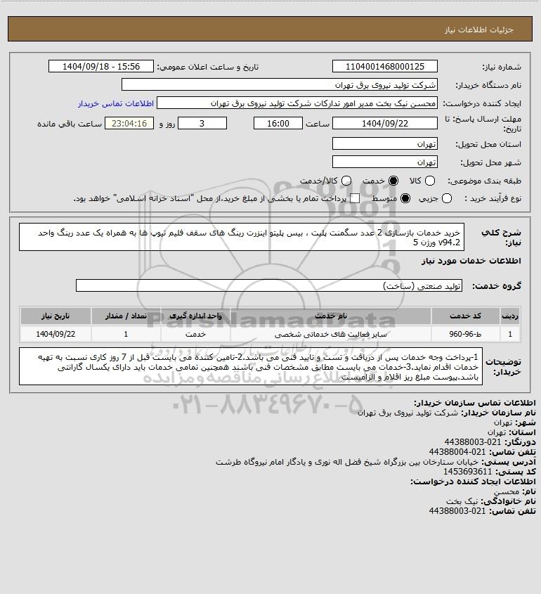 شرح کلی نیاز: خرید خدمات بازسازی 2 عدد سگمنت پلیت ، بیس پلیتو اینزرت رینگ های سقف فلیم تیوپ ها به همراه یک عدد رینگ واحد v94.2 ورژن 5