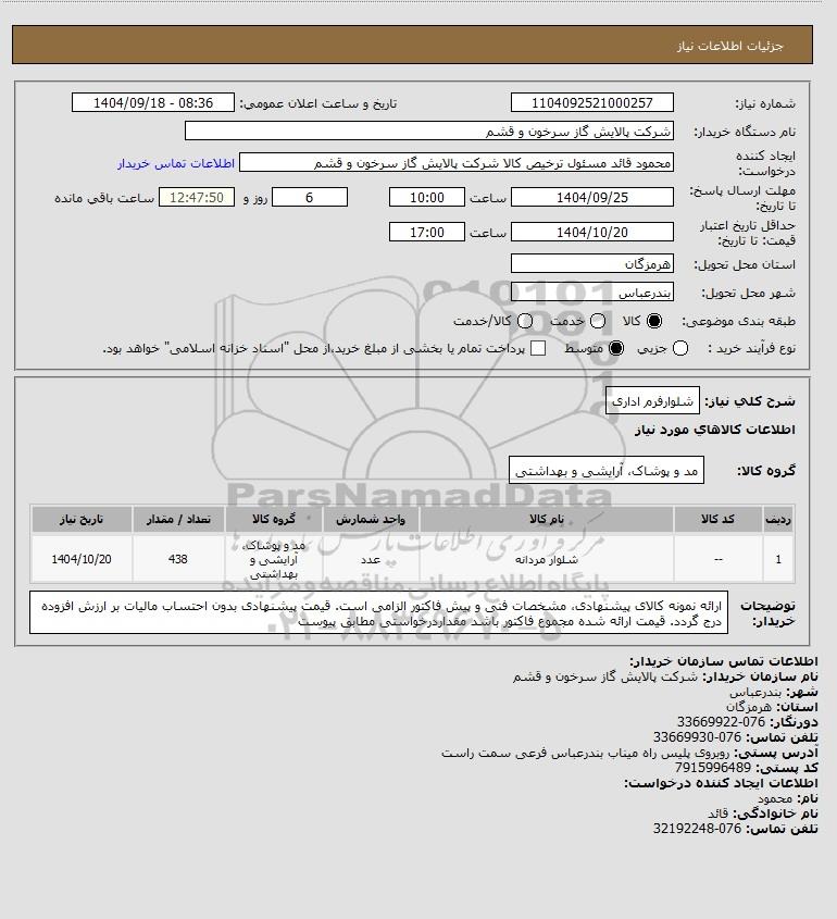 استعلام بها و موضوع استعلام استعلام شلوارفرم اداری، سامانه ستاد به اطلاع کلیه شرکت‌ها و افراد متخصص واجد شرایط می‌رساند، آگهی گذار در نظر دارد از طریق استعلام بها، نسبت به انتخاب و دریافت پیشنهادات اقدام نماید. این استعلام با کد آگهی ثبت شده در سامانه خبرگزاری پارس نماد : 9971400 منتشر شده است. مشخصات استعلام : تاریخ شروع استعلام: 1404/09/18 آخرین مهلت ارسال پیشنهاد قیمت : 1404/09/25 و محل اجرای پروژه : استان هرمزگان میباشد. استعلام قیمت مورد درخواست : استعلام شلوارفرم اداری، سامانه ستاد با دسته‌بندی‌های تخصصی و گروه های مرتبط : البسه و پوشاک, استعلام اطلاع رسانی میگردد.