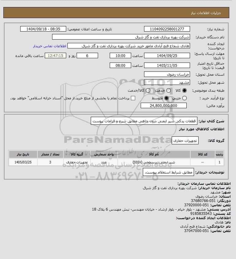 شرح کلی نیاز: قطعات یدکی شیر ایمنی درون چاهی مطابق شرح و الزامات پیوست