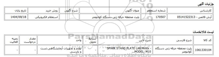 | آرش قائمی - 05141522313 | 170507 | پلیت محفظه جرقه زنی دستگاه کوانتومتر | استعلام الکترونیکی | 1404/09/18 |