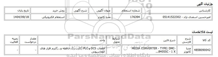 | امیرحسین اسعدی نژاد - 05141522302 | 176394 | مدیا کانورتر | استعلام الکترونیکی | 1404/09/18 |