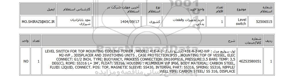 | 52506515 | Level switch | 1 | خرید تجهیزات وقطعات یدکی | کشوری | 1404/09/17 | محمد بابانژادیان شیرازی | MO.SHIRAZI@KSC.IR |