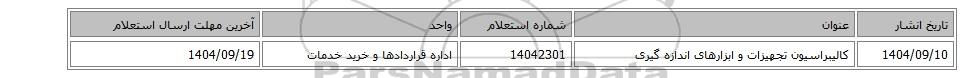 | 1404/09/10 | کالیبراسیون تجهیزات و ابزارهای اندازه گیری | 14042301 | اداره قراردادها و خرید خدمات | 1404/09/19 |