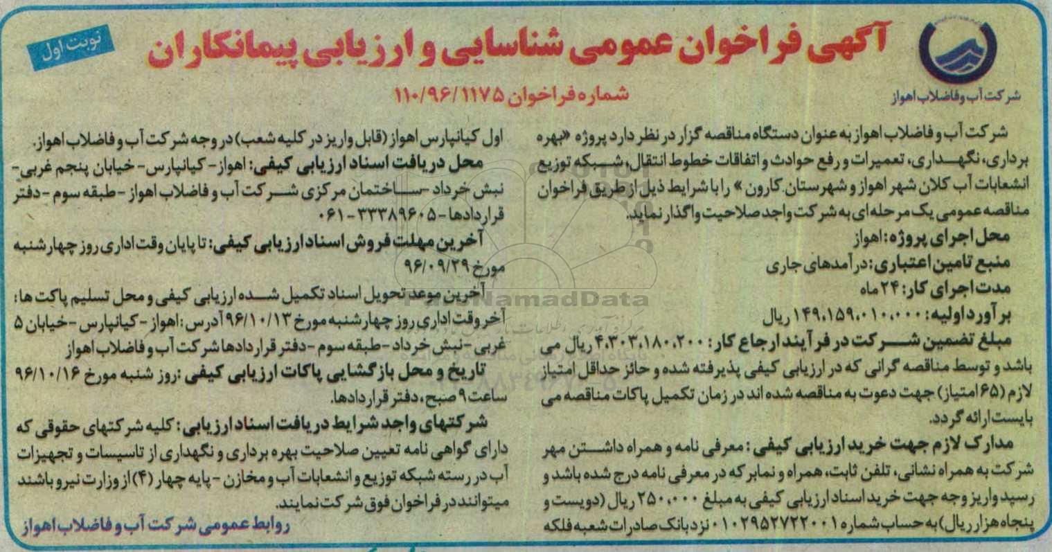 فراخوان ارزیابی بهره برداری، نگهداری، تعمیرات و رفع حوادث و انشعابات آب ..., مناقصه عمومی, فراخوان ارزیابی بهره برداری، نگهداری، تعمیرات و رفع حوادث و انشعابات آب ...