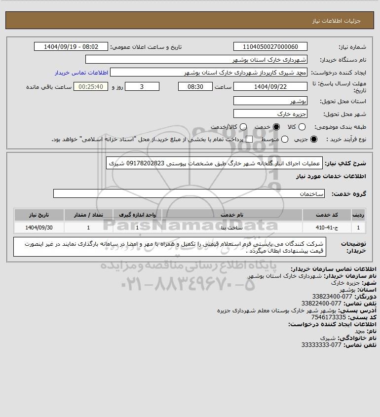 شرح کلی نیاز: عملیات اجرای انبار گلخانه شهر خارگ طبق مشخصات پیوستی