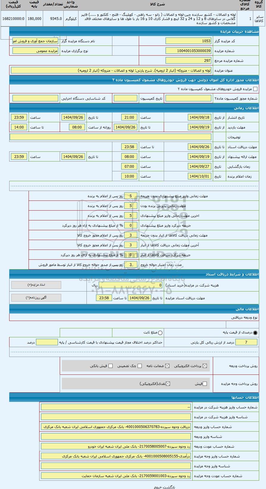 | عنوان مزایده | لوله و اتصالات - متروکه (انبار 2 ارومیه) | |||