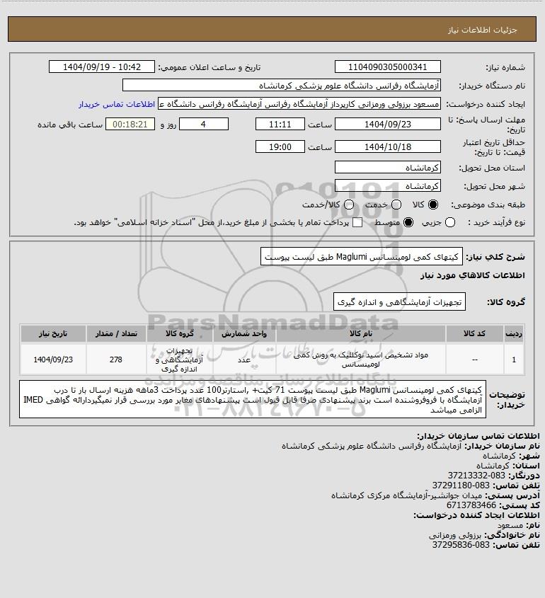 استعلام بها و موضوع استعلام استعلام کیتهای کمی لومینسانس Maglumi طبق لیست پیوست به اطلاع کلیه شرکت‌ها و افراد متخصص واجد شرایط می‌رساند، آگهی گذار در نظر دارد از طریق استعلام بها، نسبت به انتخاب و دریافت پیشنهادات اقدام نماید. این استعلام با کد آگهی ثبت شده در سامانه خبرگزاری پارس نماد : 9974924 منتشر شده است. مشخصات استعلام : تاریخ شروع استعلام: 1404/09/19 آخرین مهلت ارسال پیشنهاد قیمت : 1404/09/23 و محل اجرای پروژه : استان کرمانشاه میباشد. استعلام قیمت مورد درخواست : استعلام کیتهای کمی لومینسانس Maglumi طبق لیست پیوست با دسته‌بندی‌های تخصصی و گروه های مرتبط : خدمات و تجهیزات آزمایشگاهی و پزشکی, استعلام اطلاع رسانی میگردد.