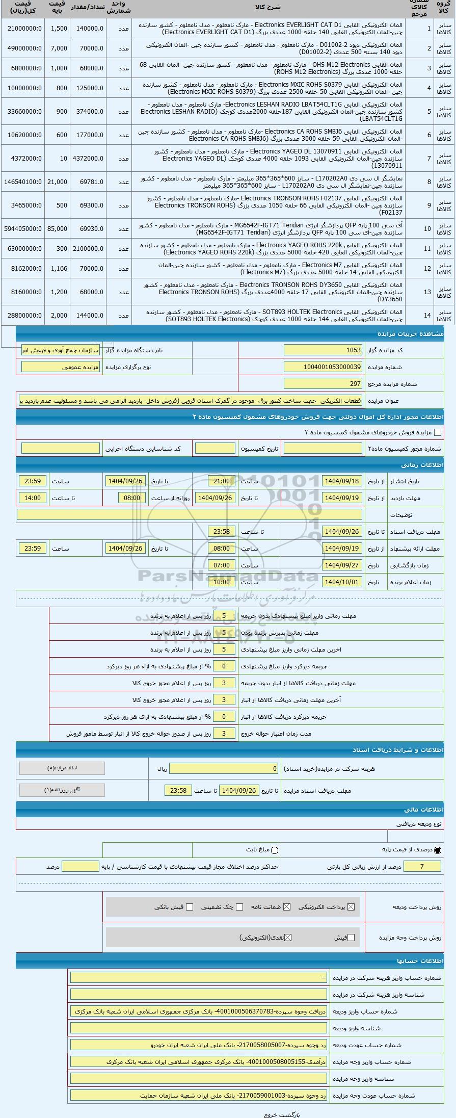 مزایده ، قطعات الکتریکی  جهت ساخت کنتور برق  موجود در گمرک استان قزوین (فروش داخل- بازدید الزامی می باشد و مسئولیت عدم بازدید بر