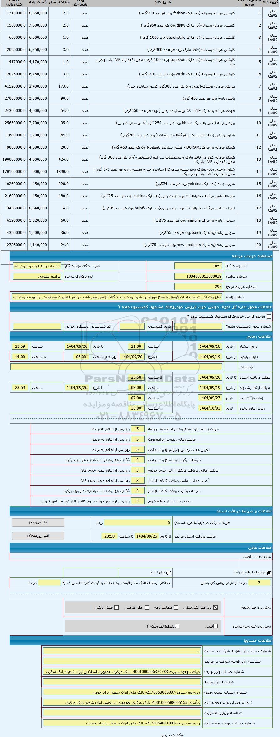 | عنوان مزایده | انواع پوشاک بشرط صادرات فروش با وضع موجود و بشرط رویت بازدید کالا الزامی می باشد در غیر اینصورت مسئولیت بر عهده خریدار است | |||