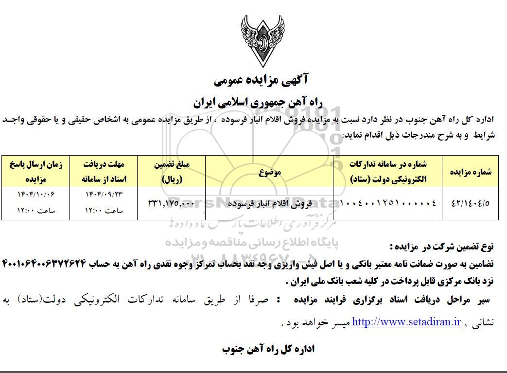 اداره کل راه آهن جنوب در نظر دارد نسبت به مزایده فروش اقلام انبار فرسوده، از طریق مزایده عمومی به اشخاص حقیقی و یا حقوقی واجد شرایط و به شرح مندرجات ذیل اقدام نماید.