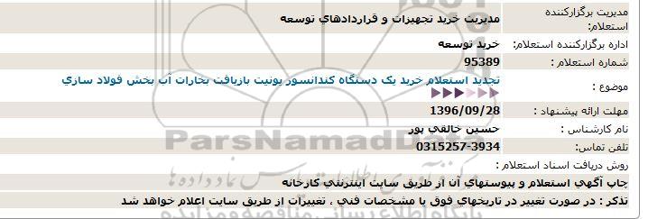 موضوع : تجدید استعلام خرید یک دستگاه کندانسور یونیت بازیافت بخارات آب بخش فولاد سازی