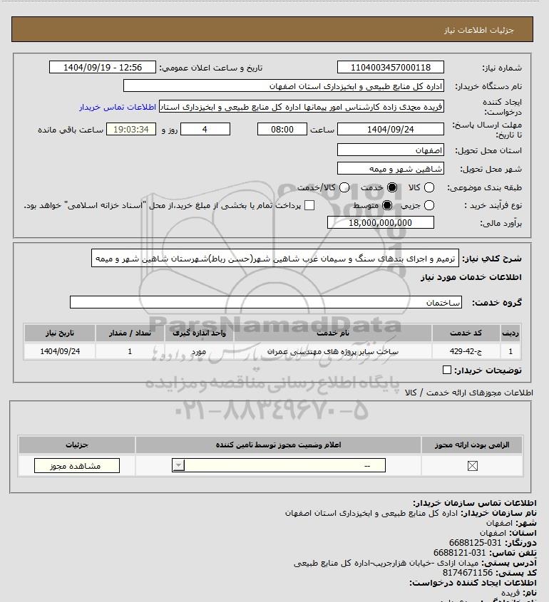 شرح کلی نیاز: ترمیم و اجرای بندهای سنگ و سیمان غرب شاهین شهر(حسن رباط)شهرستان شاهین شهر و میمه