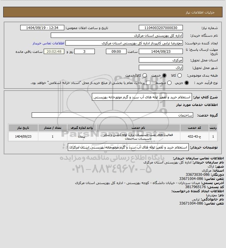 شرح کلی نیاز: استعلام خرید و تعمیر لوله های آب سرد و گرم موتورخانه بهزیستی