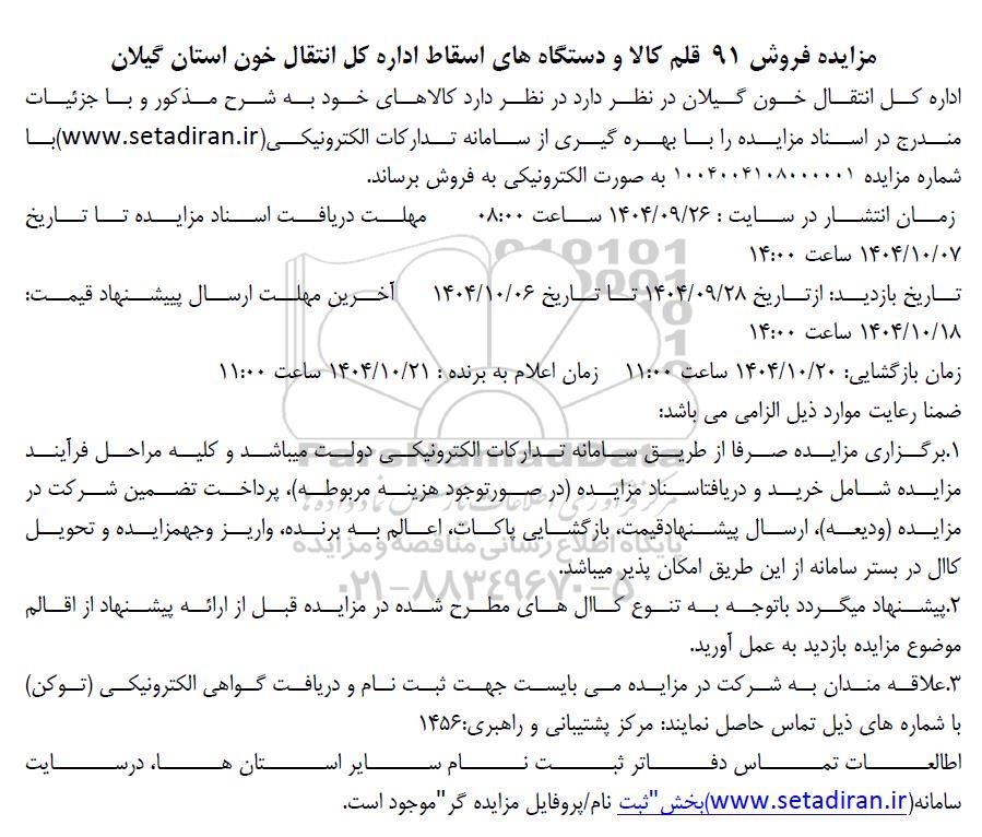 اداره کل انتقال خون گیلان در نظر دارد در نظر دارد کالاهای خود به شرح مذکور و با جزئیات مندرج در اسناد مزایده را با بهره گیری از سامانه تدارکات الکترونیکی (ستاد ایران) با شماره مزایده 1004004108000001 به صورت الکترونیکی به فروش برساند.