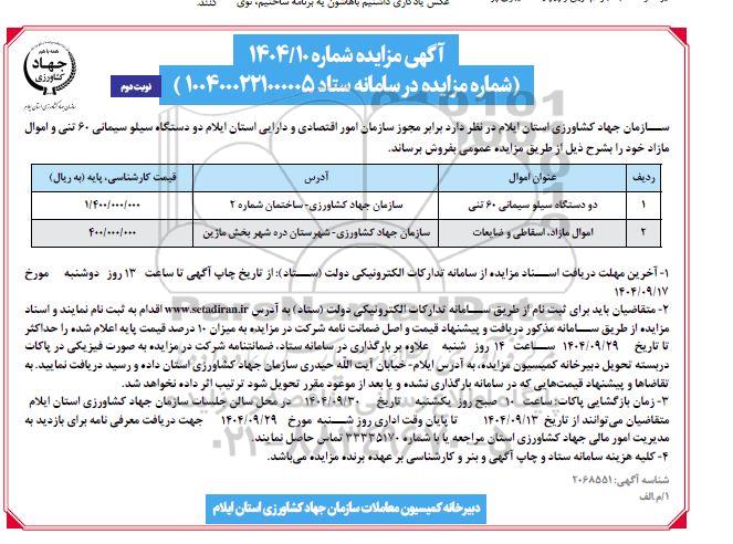 سازمان جهاد کشاورزی استان ایلام در نظر دارد برابر مجوز سازمان امور اقتصادی و دارایی استان ایلام دو دستگاه سیلو سیمانی 60 تنی و اموال مازاد خود را بشرح ذیل از طریق مزایده عمومی بفروش برساند.