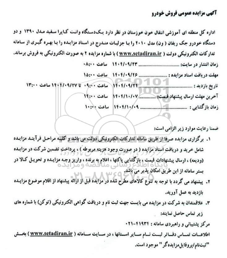 اداره کل منطقه ای آموزشی انتقال خون خوزستان در نظر دارد یک دستگاه وانت کاپرا سفید مدل 1390 و دو دستگاه خودرو جک ریفان (ون) مدل 2010 را با جزئیات مندرج در اسناد مزایده را با بهره گیری از سامانه تدارکات الکترونیکی دولت ( ستادایران) با شماره مزایده 2 به صورت الکترونیکی به فروش برساند.