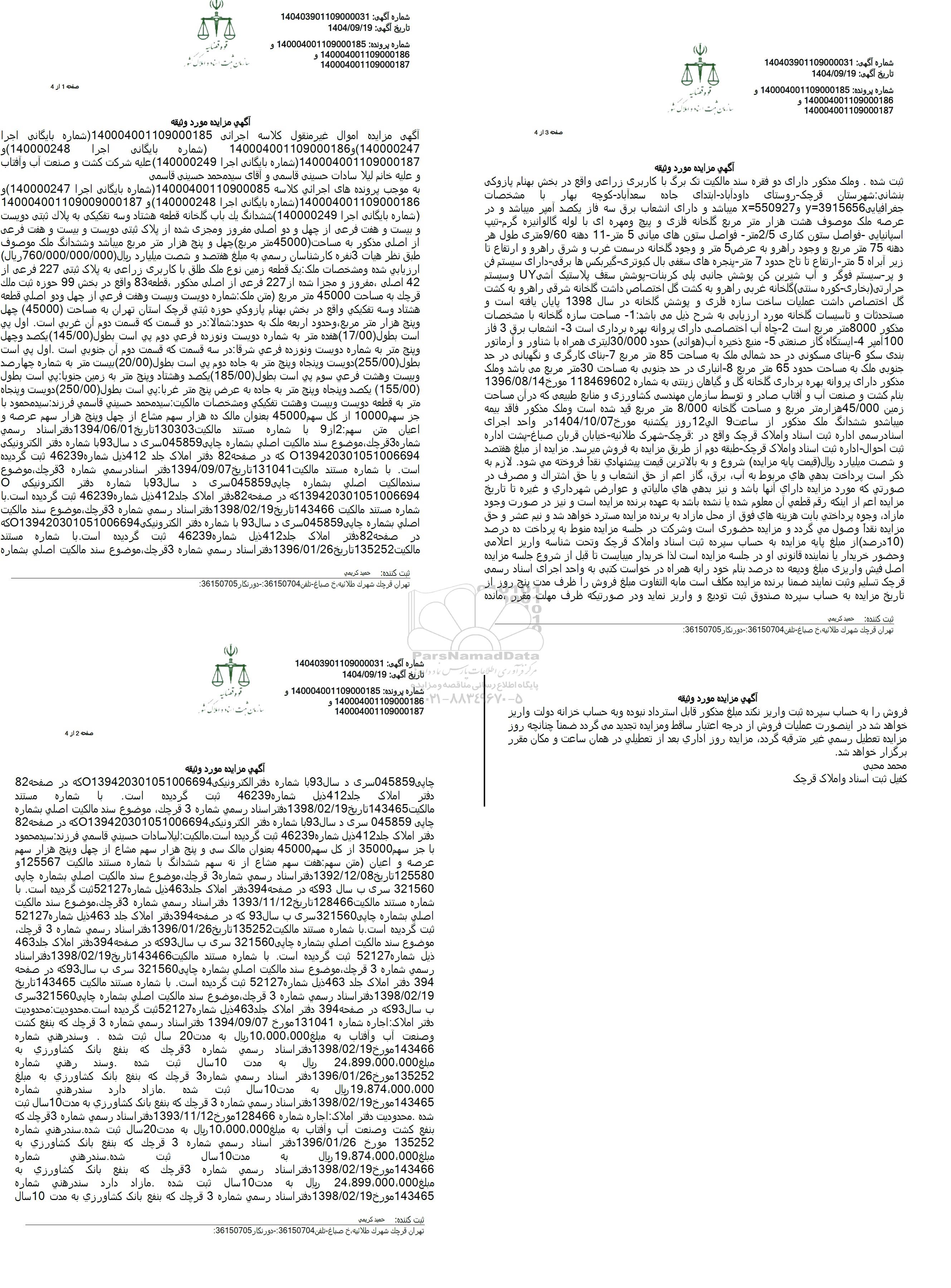 گهی مزایده اموال غیر مقول كلاسه اجرائی 140004001109000185 ( شماره بایگانی اجرا140000247)1400040011090001869 شماره پایگانی اجرا 140000248) و 140004001109000187 شماره بایگانی اجرا 140000249) علیه شرکت کشت و صنعت آب وافتابو علیه خانم لیلا سادات حسینی قاسمی و آقای سید محمد حسینی قاسمی به موجب پرونده های اجرایی کلاسه 14000400110900085 شماره بایگانی اجرا 140000247 ) و 140004001109009000187( 140004001109000186) شماره بایگانی اجرا 140000248) و شماره بایگانی اجرا (140000249) ششدانگ یک باب گلخانه قطعه هشتاد و سه تفکیکی به پلاک ثبتی دویست و بیست و هفت فرعی از چهل و دو اصلی مفرور و مجری شده از پلاک ثبتی دویست و بیست و هفت فرعی ر اصلی مذکور به به . مساحت 45000 متر مربع) چهل و پنج هزار متر مربع میباشد و شندانگ ملک موصوف ازاد طبق نظر هیات 3 نفره کارشناسان رسمی به مبلغ مقتصد و شصت میلیارد ریال (760.000.000.000 ریال) ار زبانی شده و مشخصات ملک یک قطعه رسی نوع ملک طلق با کاربری زراعی به پلاک ثبتی 227 فرعی از 42 اصلی مغرور و مجرا شده از 227 فرعی از اصلی مذکور قطعه 83 واقع در بخش 99 دوره ثبت ملک قرچک به مساحت 45000 متر مربع (متن) ملک شماره دویست و بیست و هفت فرعی از چهل و دو اصلی قطعه هشتاد و سه تفکیکی واقع در بخش بهناء باروكی حوزه شی قرچک استان تهران به مساحت (45000) چهل وبیع هزار متر مربع و حدود اربعه ملک به حدود تمالا در دو قسمت که قسمت دوم آن عربی است. اول بی است بطول (17.00) هفده شتر به شماره دوست و نوزده فرعی دوم بی است بطول (145.00) یكصد وجهل وپنج متر به شماره دویست و نورده فرعی شرقا در سه قسمت که قسمت دوم آن جنوبی است. اول پی است. بطول (255.00) دویست و پنجاه و پنج متر به جاده دوم بی است بطول (20.00) بیست متر به شماره چهارصد ویست و هشت فرعی سوم بی است بطول (185.00) یکصد و هشتاد و پنج متر به زمن جونایی است بطول (155.00) یكصد و پنجاه و پنج متر به جاده به عرض پنج متر غربایی است بطول (250.00) دویست و پنجاه متر به قطعه دوست و بست و هشت نمک دوست و بیست و هشت تفكیكی ومشخصات مالكیب سید محمد حسینی فاسمی فرزند سید محمود با در سهم 10000 از کل سپر 45000 بعنوان مالک ده هزار سهم صناع از چهل و پنج هزار سهم عرضه و اعبان من سهم 2 از لا با شماره مستند مالکیت 130303 تاریخ 1394.06.01 دفتر اسناد رسمی شماره 3 فرجك موضوع سند مالکیت اصلی بشماره چاپی 045859 سری در سال 93 با شماره دفتر الکترونیکی 139420301051006694 که در صفحه 82 دانتر املاک جلد 412 ذیل شمار 46239 ثبت گردیده است. با شماره مستند مالکیب 1 13104 تاریخ 1394.09.07 دفتر اسناد رسمی شماره الفرجك موضوع 0139420301051006694 سند مالكیت اصلی شماره چاپر 045859 سری در سال 93 با شماره دفتر الكترونیكی . در 139420301051006694 که در صفحه 02 دفتر ملاک جلد 412 دیل شماره 46239 ثبت گردیده است. با شماره مستند مالكتب 143466 تاریخ 1398.02.19 دفتر اسناد رسمی شماره 3 فرجك موضوع سند مالكیب اصلی بشماره چاپی 045859 سری در سال 93 با شماره دفتر الکترونیکی 139420301051006694 ملاک جلد 412 دل شماره 48239 - شت گردیده است. با شماره هستند سالك 135252 تاریخ 1396.01.26 دفتر اسناد رسمی شماره 3 فرجك موضوع سند مالکیت اصلی شماره جابر 045859 سری در سال 93 با شمارة دفتر الكترونيكي 139420301051008894 که در صفحه 82دفتر املاک جلد ذیل 412 موسم شماره 46239 ثبت گردیده است. با شماره مستند مالكيت 143465 تاريخ 1388.02.19 دفتر اسناد رسمی شماره 3 فرجك موضوع سند مالکیت اصلی بشماره جایی 045859 سری در سال 93) شماره بشير الكترونيكي 0139420301051006694 که در صفحه 82 دفتر املاک چند 12 4 ذیل شماره 46239 ثبت گردیده است. مالکیت لیلا سادات حسینی قاسمی فرزند سید محمود با جز سهم 35000 از کل سهم 45000 بعنوان مالک سی و پنج هزار سهم مشاع از چهل و پنج هزار سهم عرصه و اعیان ام سهم گفت سهم صناع از به سهم ششدانگ با شماره مستند مالکیت 125567 و 125580 تاريخ 1392.12.08 دفتر اسناد رسمی شماره 3 و شماره 3 فرجك موضوع سند مالكيت اصلي مالکیت اصلی بشماره جایی 321560 سری به سال 93 در صفحه 394 دفتر املاک جلد 463 ديل شماره 52127 ست گردیده است. با شماره مستند مالكيب 128466 تاريخ 1393.11.12 دفتر اسناد رسمی شماره 3 فرجك موضوع سند مالكيت اصلی شماره جایی 321560 سری به سال 93 که در صفحه در صف