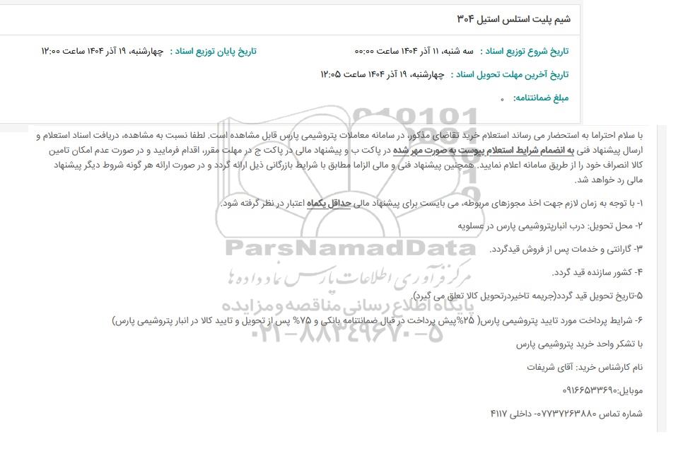 با سلام احتراما به استحضار میرساند استعلام خرید تقاضای مذکور در سامانه معاملات پتروشیمی پارس قابل مشاهده است. لطفا نسبت به مشاهده دریافت اسناد استعلام و ارسال پیشنهاد فنی به انضمام شرایط استعلام پیوست به صورت مهر شده در پاکت ب و پیشنهاد مالی در پاکت ج در مهلت مقرر اقدام فرمایید و در صورت عدم امکان تامین کالا انصراف خود را از طریق سامانه اعلام نمایید. همچنین پیشنهاد فنی و مالی الزاما مطابق با شرایط بازرگانی ذیل ارائه گردد و در صورت ارائه هر گونه شروط دیگر پیشنهاد مالی رد خواهد شد.