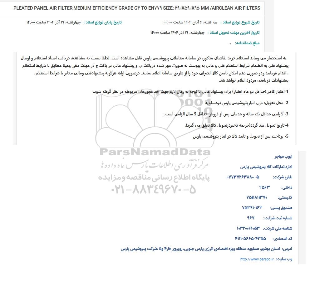 به استحضار می رساند استعلام خرید تقاضای مذکور در سامانه معاملات پتروشیمی پارس قابل مشاهده است. لطفا نسبت به مشاهده دریافت اسناد استعلام و ارسال پیشنهاد فنی به انضمام شرایط استعلام فنی و مالی به پیوست به صورت مهر شده در پاکت ب و پیشنهاد مالی در پاکت ج در مهلت مقرر و عینا مطابق با شرایط استعلام اقدام فرمایید و در صورت عدم امکان تامین کالا انصراف خود را از طریق سامانه اعلام نمایید. در صورت ارایه هرگونه پیشنهاد فنی و مالی مغایر با شرایط استعلام . پیشنهادات دریافتی مردود اعلام خواهد شد.