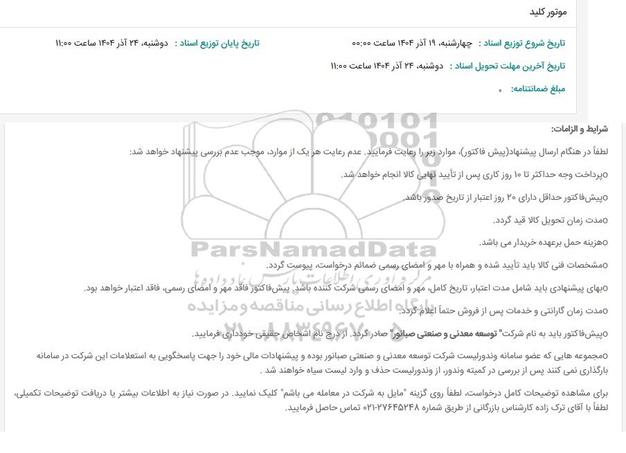 در صورت نیاز به دریافت راهنمایی یا پشتیبانی در خصوص استعلام و مناقصه و فراخوان مناقصه عمومی، مناقصه محدود، مناقصه بین‌ المللی، مناقصه دولتی، مناقصه خصوصی، مناقصه آنلاین فروش تجهیزات، مناقصه مشاوره‌ای مناقصه پتروشیمی و انرژی مناقصه صنایع و تجهیزات برق و مخابرات و نفت و گاز ... لطفاً با سایت خبری مناقصه و مزایده پارس‌نماد داده‌ها به شماره 88349670 تماس حاصل فرمایید.