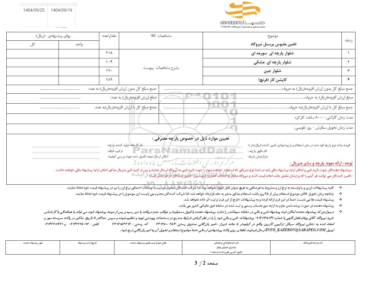| ردیف | موضوع : تامین ملبوس پرسنل نیروگاه |