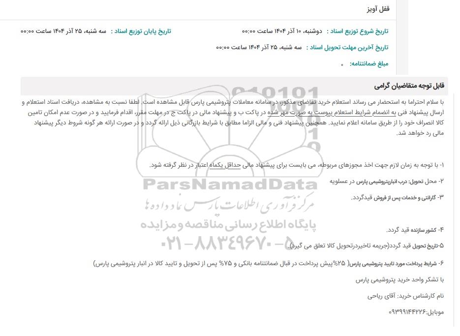 - شرایط پرداخت مورد تایید پتروشیمی پارس 25 %پیش پرداخت در قبال ضمانتنامه بانکی و 75 %پس از تحویل و تایید کالا در انبار پتروشیمی پارس