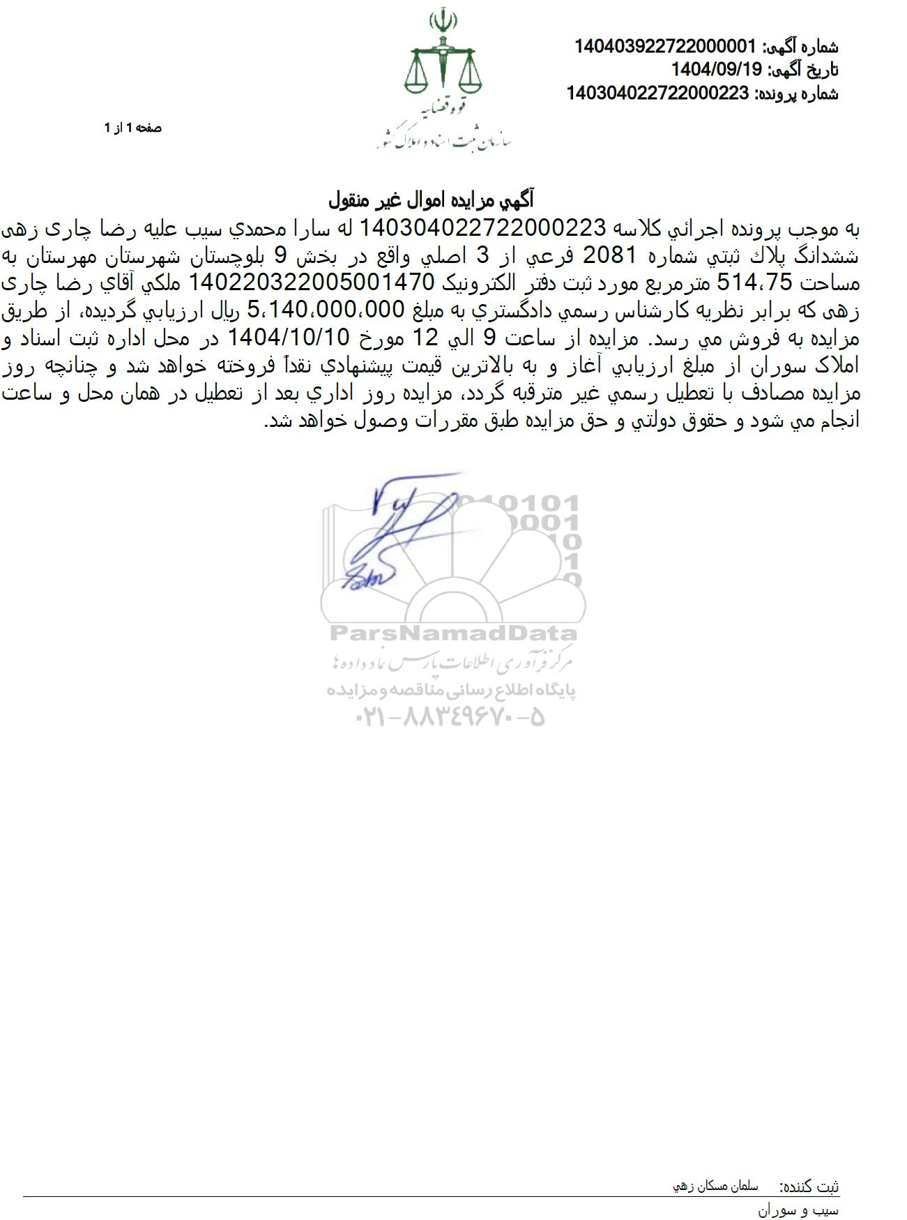 به موجب پرونده اجرائی کلاسه 140304022722000223 له سارا محمدی سیب علیه رضا چاری زهی ششدانگ پلاک ثبتی شماره 2081 فرعی از 3 اصلی واقع در بخش 9 بلوچستان شهرستان مهرستان به مساحت 75، 514 متر مربع مورد ثبت دفتر الکترونیک 140220322005001470 ملکی آقای رضا چاری زهی که برابر نظریه کارشناس رسمی دادگستری به مبلغ 5.140.000.000 ریال ارزیابی گردیده از طریق مزایده به فروش میرسد. مزایده از ساعت 9 الی 12 مورخ 1404.10.10 در محل اداره ثبت اسناد و املاک سوران از مبلغ ارزیابی آغاز و به بالاترین قیمت پیشنهادی نقدا فروخته خواهد شد و چنانچه روز مزایده مصادف با تعطیل رسمی غیر مترقبه گردد مزایده روز اداری بعد از تعطیل در همان محل و ساعت انجام میشود و حقوق دولتی و حق مزایده طبق مقررات وصول خواهد شد.