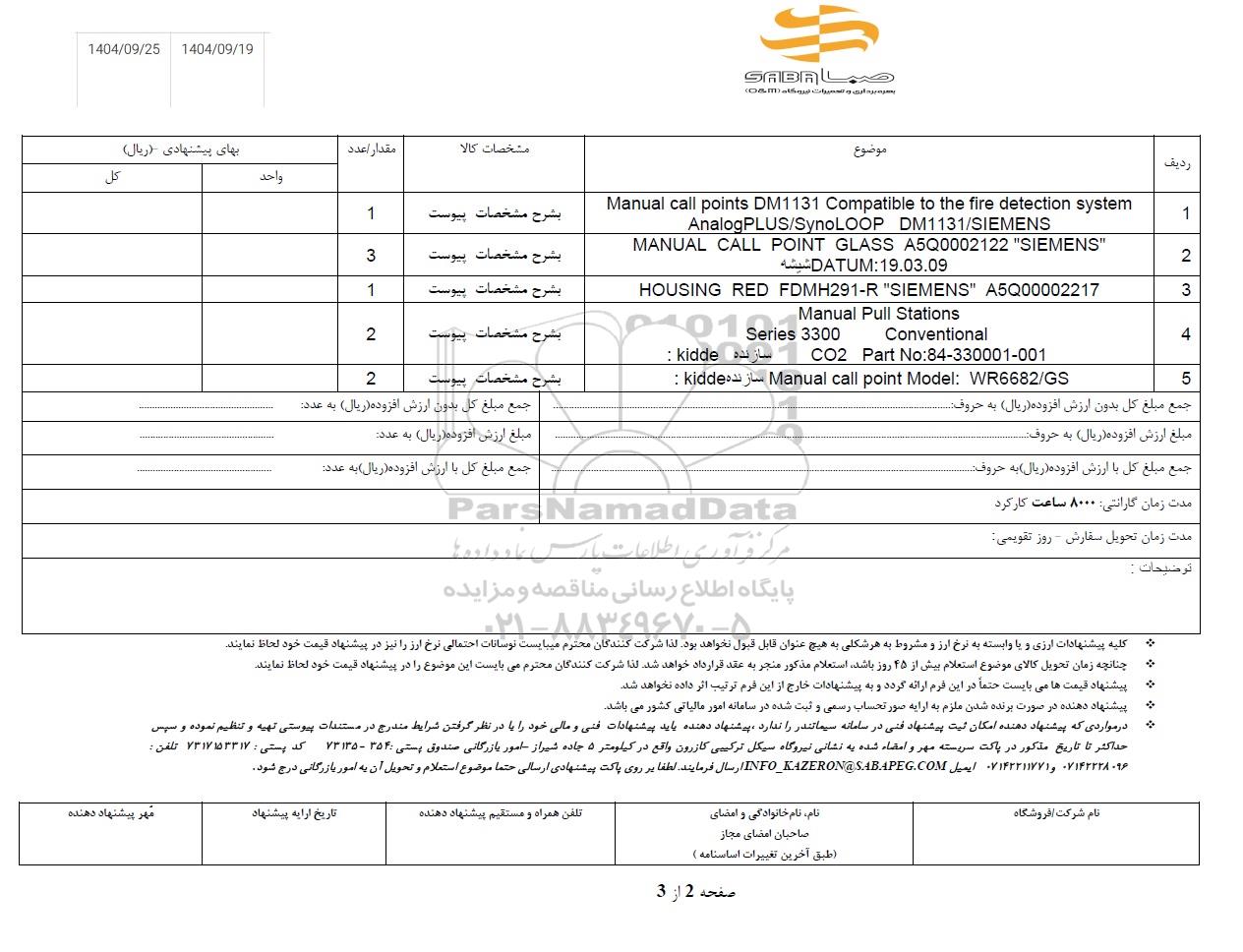 * در مواردی که پیشنهاد دهنده امکان ثبت پیشنهاد فنی در سامانه سیماتندر را ندارد، پیشنهاد دهنده باید پیشنهادات فنی و مالی خود را با در نظر گرفتن شرایط مندرج در مستندات پیوستی تهیه و تنظیم نموده و سپس حداکثر تا تاریخ مذکور در پاکت سریسته مهر و امضاء شده به نشانی نیروگاه سیکل ترکیبی کازرون، واقع در کیلومتر 5 جاده شیراز امور بازرگانی صندوق پستی : 354 - 73135 کدپستی: 7317153317 تلفن : 07142228096 و 07142211771 ایمیل INFO_KAZERON@SABAPEG.COM ارسال فرمایند.