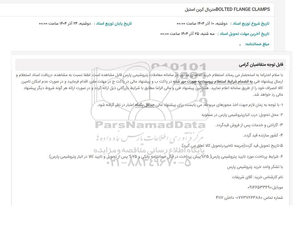 با سلام احتراما به استحضار میرساند استعلام خرید تقاضای مذکور در سامانه معاملات پتروشیمی پارس قابل مشاهده است. لطفا نسبت به مشاهده دریافت اسناد استعلام و ارسال پیشنهاد فنی به انضمام شرایط استعلام پیوست به صورت مهر شده در پاکت ب و پیشنهاد مالی در پاکت ج در مهلت مقرر اقدام فرمایید و در صورت عدم امکان تامین کالا انصراف خود را از طریق سامانه اعلام نمایید. همچنین پیشنهاد فنی و مالی الزاما مطابق با شرایط بازرگانی ذیل ارائه گردد و در صورت ارائه هر گونه شروط دیگر پیشنهاد مالی رد خواهد شد.