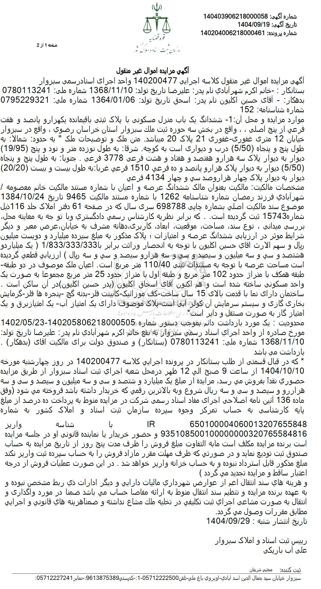 آگهی مزایده اموال غیر منقول کلاسه اجرایی 140200477 واحد اجرای اسناد رسمی سبزوار