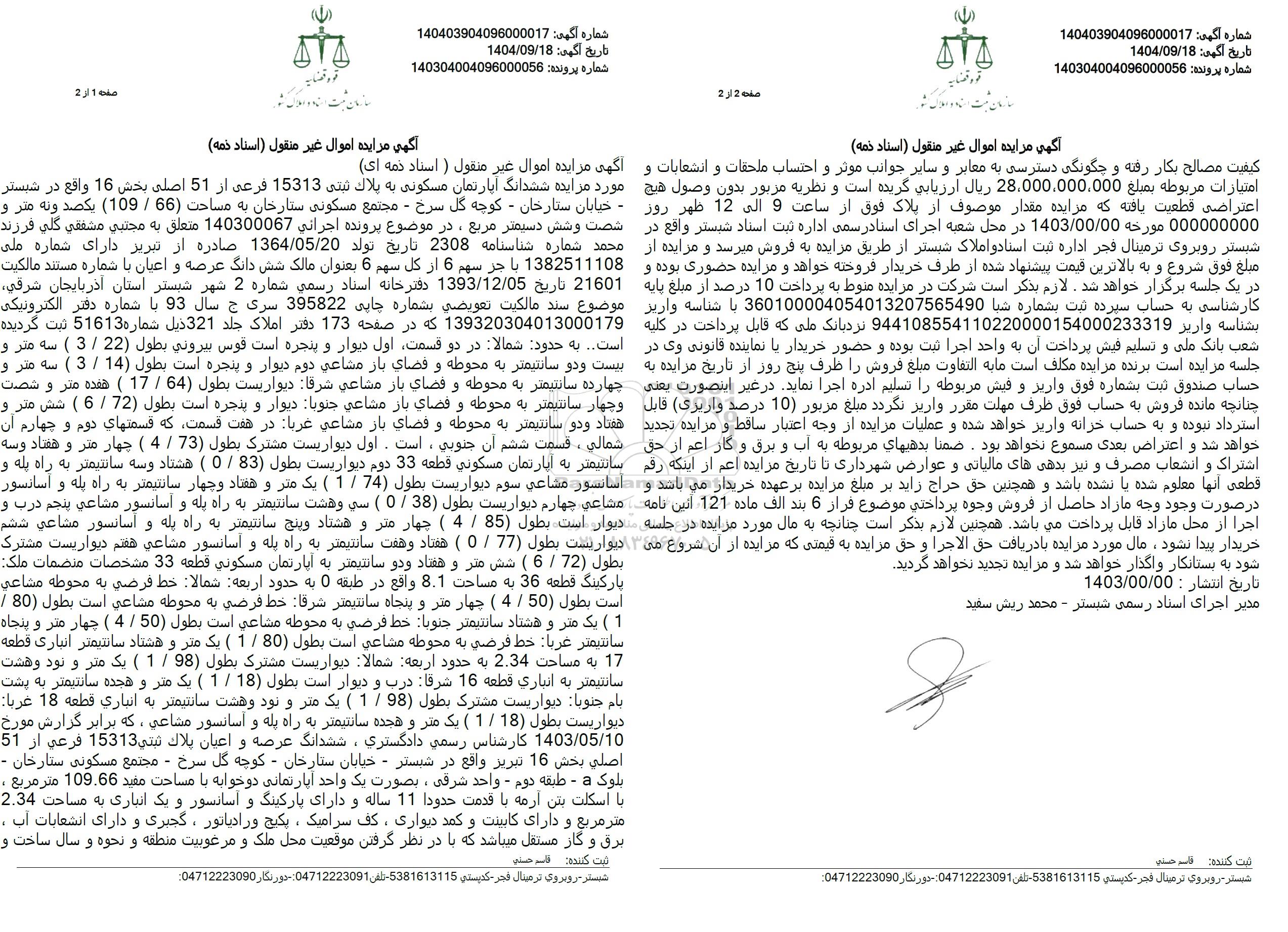 آگهی مزایده اموال غیر منقول ( استاد ذمه ای) مورد مزایده ششدانگ آپارتمان مسکونی به پلاك ثبتي 15313 فرعی از 51 اصلی بخش 16 واقع در شبستر خیابان ستارخان - کوچه گل سرخ - مجتمع مسکونی ستارخان به مساحت (66) / 109) يكصد ونه متر و شصت و شش دسیمتر مربع در موضوع پرونده اجرائي 140300067 متعلق به مجتبی مشفقی گلی فرزند محمد شماره شناسنامه 2308 تاريخ تولد 1364/05/20 صادره از تبریز دارای شماره ملی 1382511108 با جر سهم 6 از کل سهم 6 بعنوان مالک شش دانگ عرصه و اعیان با شماره مستند مالکیت 21601 تاریخ 1393/12/05 دفترخانه اسناد رسمی شماره 2 شهر شبستر استان آذربایجان شرقی موضوع سند مالکيت تعويضي بشماره چاپی 395822 سری ج سال 93 با شماره دفتر الکترونیکی 139320304013000179 که در صفحه 173 دفتر املاک جلد 321 ذیل شماره 51613 ثبت گردیده است. به حدود شمالا در دو قسمت اول دیوار و پنجره است قوس بیرونی بطول 22 / 3 ) سه متر و بیست و دو سانتیمتر به محوطه و فضای باز مشاعی دوم دیوار و پنجره است بطول 14 / 3 ) سه متر و چهارده سانتیمتر به محوطه و فضای باز مشاعی شرقا دیواریست بطول (64) / 17 ) هفده متر و شصت و چهار سانتیمتر به محوطه و فضای باز مشاعی جنوبا دیوار و پنجره است بطول 72 / 6 ) شش متر و هفتاد و دو سانتیمتر به محوطه و فضای باز مشاعي غربا در هفت قسمت که قسمتهای دوم و چهارم آن شمالی، قسمت ششم آن جنوبی است. اول دیواریست مشترك بطول (73) / 4 ) چهار متر و هفتاد و سه سانتیمتر به آپارتمان مسكوني قطعه 33 دوم دیواریست بطول 83 / 0 ) هشتاد و سه سانتیمتر به راه پله و آسانسور مشاعی سوم دیواریست بطول (74 / 1 ) یک متر و هفتاد و چهار سانتیمتر به راه پله و آسانسور مشاعی چهارم دیواریست بطول (38) / 0 ) سي و هشت سانتیمتر به راه پله و آسانسور مشاعی پنجم درب و دیوار است بطول 85 / 4 ) چهار متر و هشتاد و پنج سانتیمتر به راه پله و آسانسور مشاعی ششم دیواریست بطول (77) / 0 ) هفتاد و هفت سانتیمتر به راه پله و آسانسور مشاعی هفتم دیواریست مشترک بطول (72 / 6 ) شش متر و هفتاد و دو سانتیمتر به آپارتمان مسكوني قطعة 33 مشخصات منضمات ملک: پارکینگ قطعه 36 به مساحت 8.1 واقع در طبقه 0 به حدود اربعة شمالا خط فرضی به محوطه مشاعي است بطول (50 / 4 ) چهار متر و پنجاه سانتيمتر شرقا خط فرضی به محوطه مشاعی است بطول (80) /(1) یک متر و هشتاد سانتیمتر جنوبا خط فرضی به محوطه مشاعي است بطول 50 / 4 ) چهار متر و پنجاه سانتیمتر غربا خط فرضی به محوطه مشاعی است بطول (80 / 1 ) یک متر و هشتاد سانتیمتر انباری قطعه 17 به مساحت 2.34 به حدود اربعه شمالا دیواریست مشترک بطول (98) / 1 ) یک متر و نود و هشت سانتیمتر به انباري قطعه 16 شرقا درب و دیوار است بطول 18 / 1 ) یک متر و هجده سانتیمتر به پشت بام جنوبا دیواریست مشترک بطول 98 / 1 ) یک متر و نود و هشت سانتیمتر به انباري قطعه 18 غربا دیواریست بطول 18 / 1 ) یک متر و هجده سانتیمتر به راه پله و آسانسور مشاعی که برابر گزارش مورخ 1403/05/10 کارشناس رسمی دادگستری، ششدانگ عرصه و اعیان پلاك ثبتي 15313 فرعی از 51 اصلي بخش 16 تبریز واقع در شبستر - خیابان ستارخان - کوچه گل سرخ - مجتمع مسکونی ستارخان -بلوک - طبقه دوم - واحد شرقی ، بصورت یک واحد آپارتمانی دوخوابه با مساحت مفید 109.66 متر مربع . با اسکلت بتن آرمه با قدمت حدودا 11 ساله و دارای پارکینگ و آسانسور و یک انباری به مساحت 2.34 متر مربع و دارای کابینت و کمد دیواری ، کف سرامیک ، پکیج و رادیاتور ، گجتری و دارای انشعابات آب . برق و گاز مستقل میباشد که با در نظر گرفتن موقعیت محل ملک و مرغوبیت منطقه و نحوه و سال ساخت و کیفیت مصالح بکار رفته و چگونگی دسترسی به معابر و سایر جوانب موثر و احتساب ملحقات و انشعابات و امتیازات مربوطه بمبلغ 28.000.000.000 ریال ارزیابی گریده است و نظریه مزبور بدون وصول هیچ اعتراضی قطعیت یافته که مزایده مقدار موصوف از پلاک فوق از ساعت 9 الى 12 ظهر روز 000000000 مورخه 1403.00.00 در محل شعبه اجرای اسناد رسمی اداره ثبت اسناد شبستر واقع در شبستر روبروی ترمینال فجر اداره ثبت اسناد و املاک شبستر از طریق مزایده به فروش میرسد و مزایده از مبلغ فوق شروع و به بالاترین قی