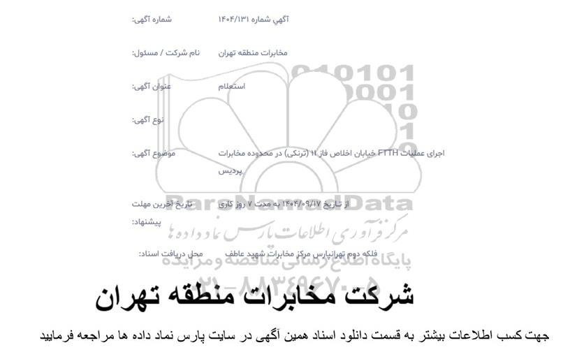 موضوع آگهی:  اجرای عملیات FTTH خیابان اخلاص فاز 11 ترنکی در محدوده مخابرات پردیس