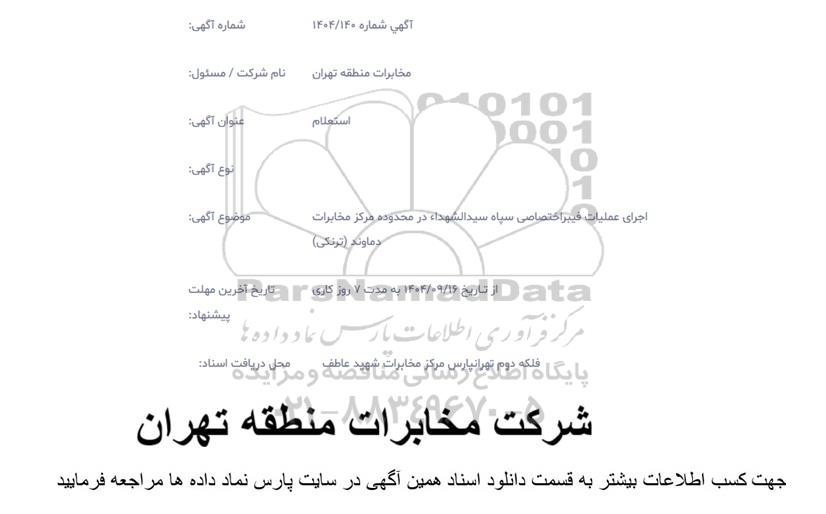 موضوع آگهی: اجرای عملیات فیبر اختصاصی سپاه سیدالشهدا در محدوده مرکز مخابرات دماوند - ترنکی