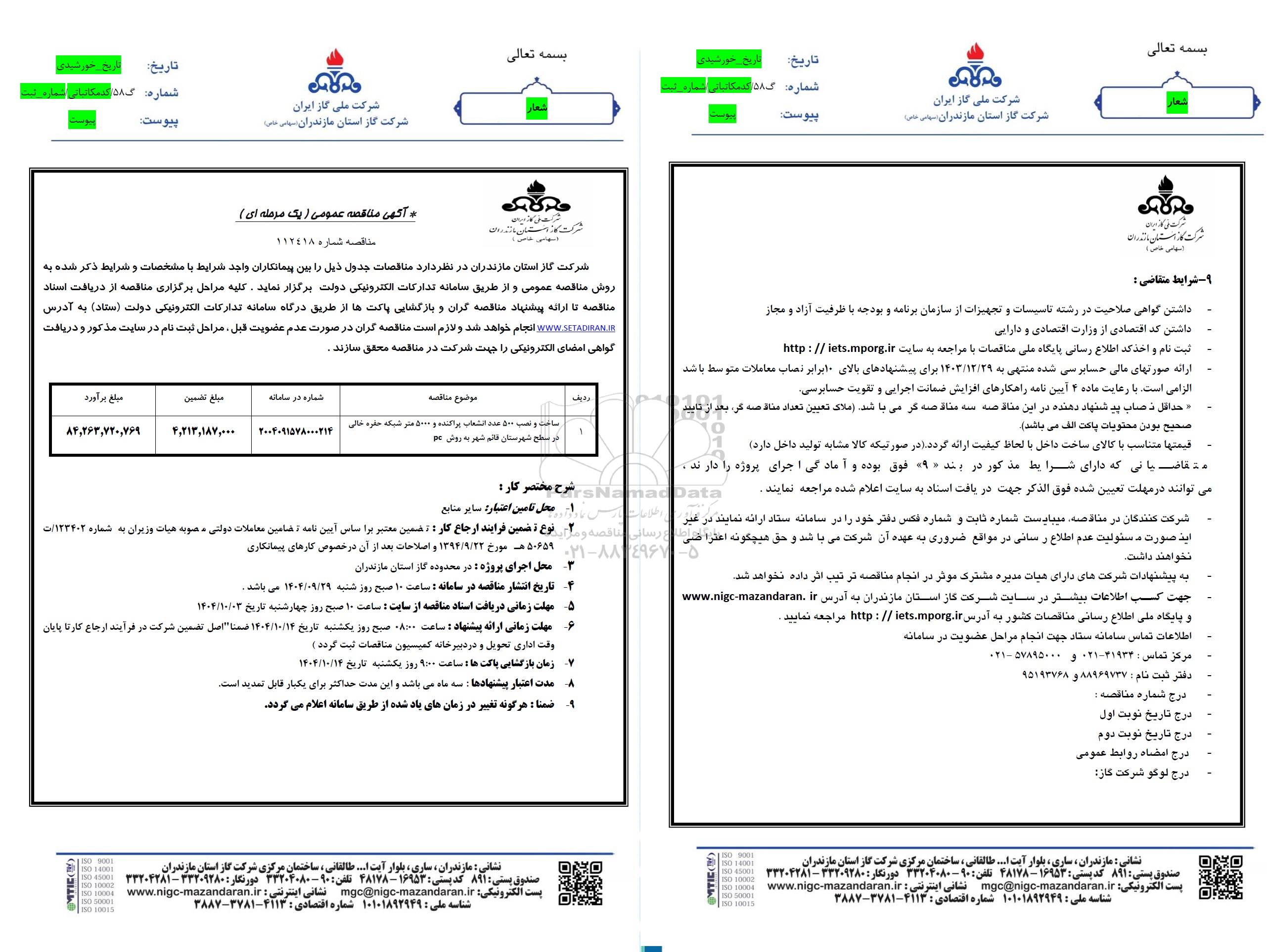 - جهت کسب اطلاعات بیشتر در سایت شرکت گاز استان مازندران به آدرس www.nigc- mazandaran ir و پایگاه ملی اطلاع رسانی مناقصات کشور به آدرس http : //iets.mporg.ir مراجعه نمایید.