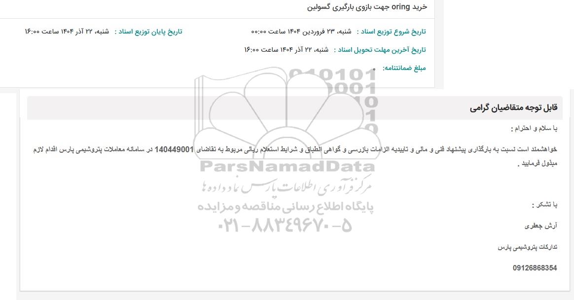 خواهشمند است نسبت به بارگذاری پیشنهاد فنی و مالی و تاییدیه الزامات بازرسی و گواهی انطباق و شرایط استعلام ریالی مربوط به تقاضای 140449001 در سامانه معاملات پتروشیمی پارس اقدام لازم مبذول فرمایید.