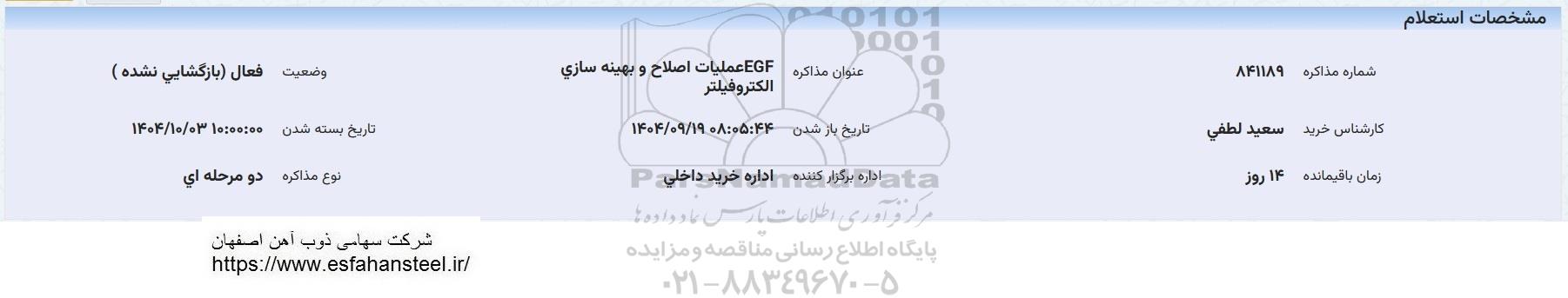 | شماره مذاکره 841189 | عنوان مذاکره EGF عملیات اصلاح و بهینه سازی الکتروفیلتر | وضعت فعال بازگشایی نشده |