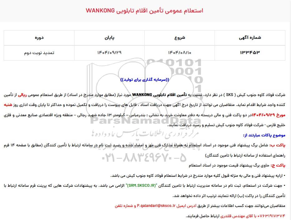 شرکت فولاد کاوه جنوب کیش (SKS) در نظر دارد نسبت به تامین اقلام تابلویی WANKONG مورد نیاز مطابق موارد مندرج در اسناد از طریق استعلام عمومی ریالی از تأمین کننده واجد شرایط اقدام نماید. متقاضیان می توانند از تاریخ درج آگهی جهت دریافت اسناد، فایلهای پیوست را دریافت و تکمیل نموده و حداکثر تا پایان وقت اداری روز شنبه مورخ 1404.09.29 در دو پاکت فنی و مالی دربسته به دفتر معاونت خرید به نشانی : بندر عباس - کیلومتر 13 جاده شهید رجائی - منطقه ویژه اقتصادی صنایع معدنی و فلزی خلیج فارس - شرکت فولاد کاوه جنوب کیش تسلیم و رسید دریافت نمایند.