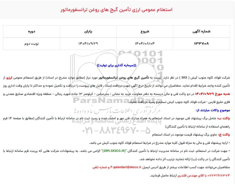 شرکت فولاد کاوه جنوب کیش (SKS) در نظر دارد نسبت به تامین گیج های روغن ترانسفورماتور مورد نیاز (مطابق موارد مندرج در اسناد) از طریق استعلام عمومی ریالی از تأمین کننده واجد شرایط اقدام نماید. متقاضیان می توانند از تاریخ درج آگهی جهت دریافت اسناد، فایلهای پیوست را دریافت و تکمیل نموده و حداکثر تا پایان وقت اداری روز شنبه مورخ 1404.09.29 در دو پاکت فنی و مالی دربسته به دفتر معاونت خرید به نشانی : بندر عباس - کیلومتر 13 جاده شهید رجائی - منطقه ویژه اقتصادی صنایع معدنی و فلزی خلیج فارس - شرکت فولاد کاوه جنوب کیش تسلیم و رسید دریافت نمایند.