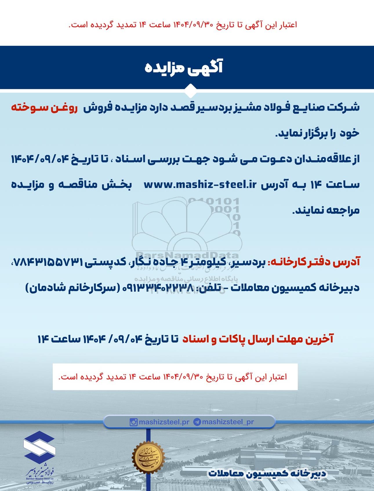شرکت صنایع فولاد مشیز بردسیر قصد دارد مزایده فروش روغن سوخته خود را برگزار نماید. از علاقه مندان دعوت می شود جهت بررسی اسناد تا تاریخ 1404.09.04 ساعت 14 به آدرس www.mashiz-steel.ir بخش مناقصه و مزایده مراجعه نمایند.
