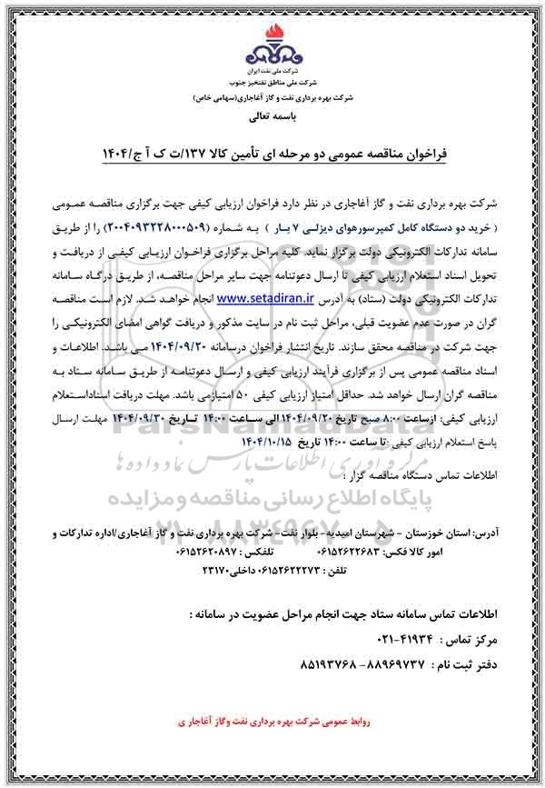 شرکت بهره برداری نفت و گاز آغاجاری در نظر دارد فراخوان ارزیابی کیفی جهت برگزاری مناقصه عمومی خرید دو دستگاه کامل کمپرسورهوای دیزلی 7 بار ) به شماره 2004093228000509 را از طریق سامانه تدارکات الکترونیکی دولت برگزار نماید کلیه مراحل برگزاری فراخوان ارزیابی کیفی از دریافت و تحویل اسناد استعلام ارزیابی کیفی تا ارسال دعوتنامه جهت سایر مراحل مناقصه از طریق درگاه سامانه تدارکات الکترونیکی دولت (ستاد) به آدرس سایت ستاد ایران انجام خواهد شد. لازم است مناقصه گران در صورت عدم عضویت قبلی مراحل ثبت نام در سایت مذکور و دریافت گواهی امضای الکترونیکی را جهت شرکت در مناقصه محقق سازند تاریخ انتشار فراخوان در سامانه 1404.09.20 می باشد. اطلاعات و اسناد مناقصه عمومی پس از برگزاری فرآیند ارزیابی کیفی و ارسال دعوتنامه از طریق سامانه ستاد به مناقصه گران ارسال خواهد شد. حداقل امتیاز ارزیابی کیفی 50 امتیاز می باشد. مهلت دریافت اسناد استعلام ارزیابی کیفی از ساعت 8:00 صبح تاریخ 1404.09.20 الی ساعت 14:00 تاریخ 1404.09.30 مهلت ارسال پاسخ استعلام ارزیابی کیفی تا ساعت 14:00 تاریخ 1404.10.15