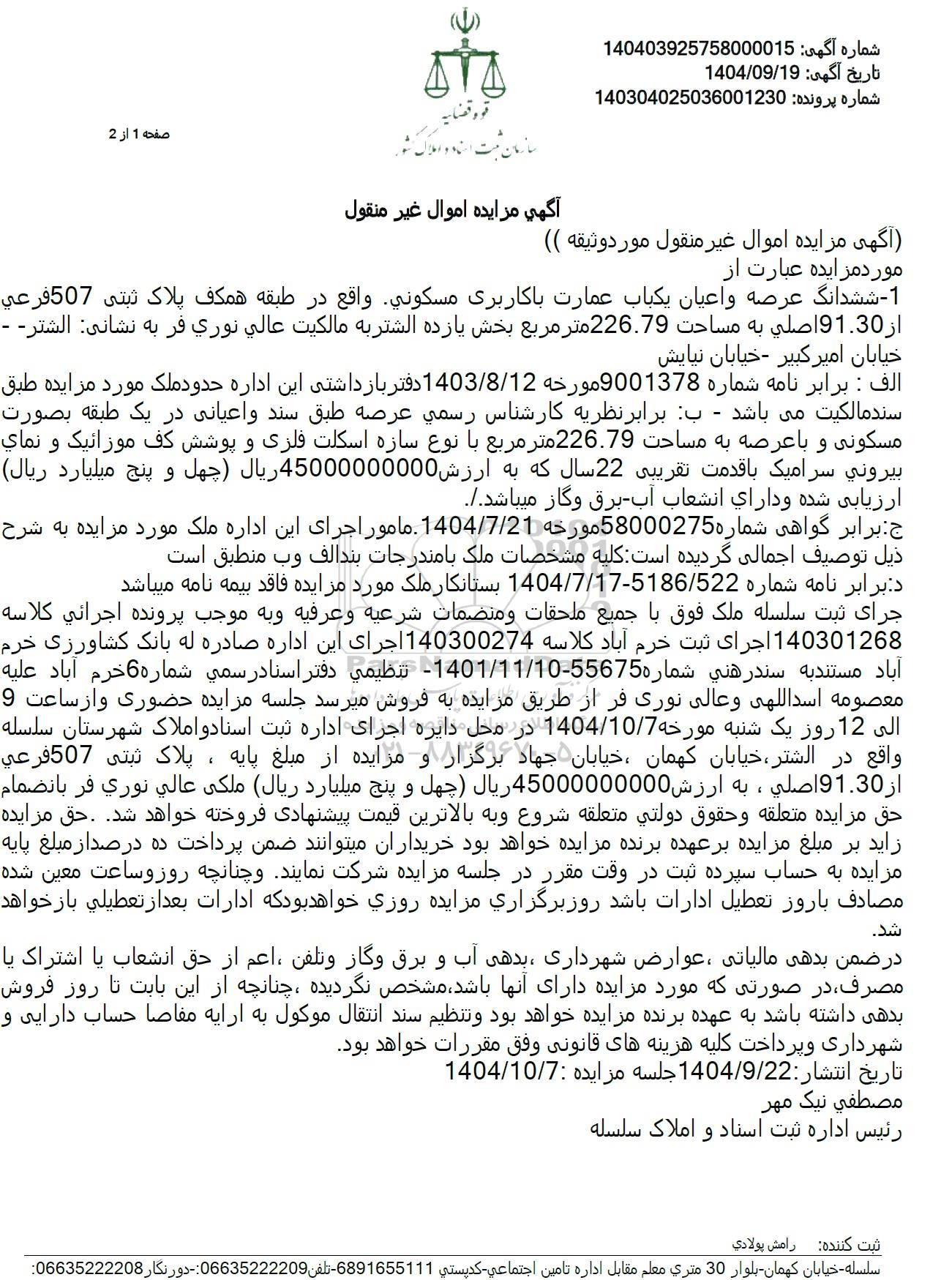 جرای ثبت سلسله ملک فوق با جميع ملحقات ومنضمات شرعيه وعرفیه و به موجب پرونده اجرائي کلاسه 140301268 اجرای ثبت خرم آباد کلاسه 140300274 اجرای این اداره صادره له بانک کشاورزی خرم آباد مستند به سندرهني شماره 55675-1401.11.10- تنظيمي دفتر اسناد رسمی شماره 6 خرم آباد عليه معصومه اسداللهی و عالی نوری فر از طریق مزایده به فروش میرسد جلسه مزایده حضوری و از ساعت 9 الى 12 روز یک شنبه مورخه 1404.10.7 در محل دایره اجرای اداره ثبت اسناد و املاک شهرستان سلسله واقع در الشتر خیابان کهمان ، خیابان جهاد برگزار و مزایده از مبلغ پایه ، پلاک ثبتی 507 فرعي از 91.30 اصلي ، به ارزش 45000000000 ریال (چهل و پنج ميليارد) ريال ملكى عالي نوري فر بانضمام حق مزایده متعلقه و حقوق دولتي متعلقه شروع و به بالاترین قیمت پیشنهادی فروخته خواهد شد. . حق مزایده زاید بر مبلغ مزایده بر عهده برنده مزایده خواهد بود خریداران میتوانند ضمن پرداخت ده در صد از مبلغ پایه مزایده به حساب سپرده ثبت در وقت مقرر در جلسه مزایده شرکت نمایند و چنانچه روز و ساعت معین شده مصادف با روز تعطیل ادارات باشد روز برگزاری مزایده روزي خواهد بود که ادارات بعد از تعطیلی بازخواهد شد.
