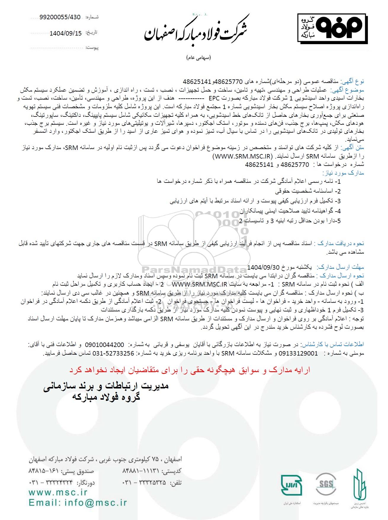 موضوع آگهی عملیات طراحی و مهندسی تهیه و تامین ساخت و حمل تجهیزات ، نصب ، تست ، راه اندازی، آموزش و تضمین عملکرد سیستم مکش بخارات اسیدی واحد اسیدشویی 1 شرکت فولاد مبارکه بصورت EPC هدف از این پروژه طراحی و مهندسی تامین ساخت، نصب، تست و راه اندازی پروژه اصلاح سیستم مکش بخار اسیدشویی شماره 1 مجتمع فولاد مبارکه است. این پروژه شامل کلیه ملزومات و مشخصات فنی سیستم تهویه صنعتی برای جمع آوری بخارهای حاصل از تانکهای خط اسیدشویی به همراه کلیه تجهیزات مکانیکی شامل سیستم پایپینگ داکتینگ، ساپورتینگ هودهای مکش پمپها برج جذب فنهای دمنده و موتور استک اجکتور دمپرها شیرآلات و یوتیلیتیهای مورد نیاز و غیره است. سیستم برج جذب بخارهای تولیدی در تانکهای اسیدشویی را در تماس با سیال آب تمیز نموده و هوای تمیز عاری از اسید را از طریق استک اجکتور وارد اتمسفر می نماید.