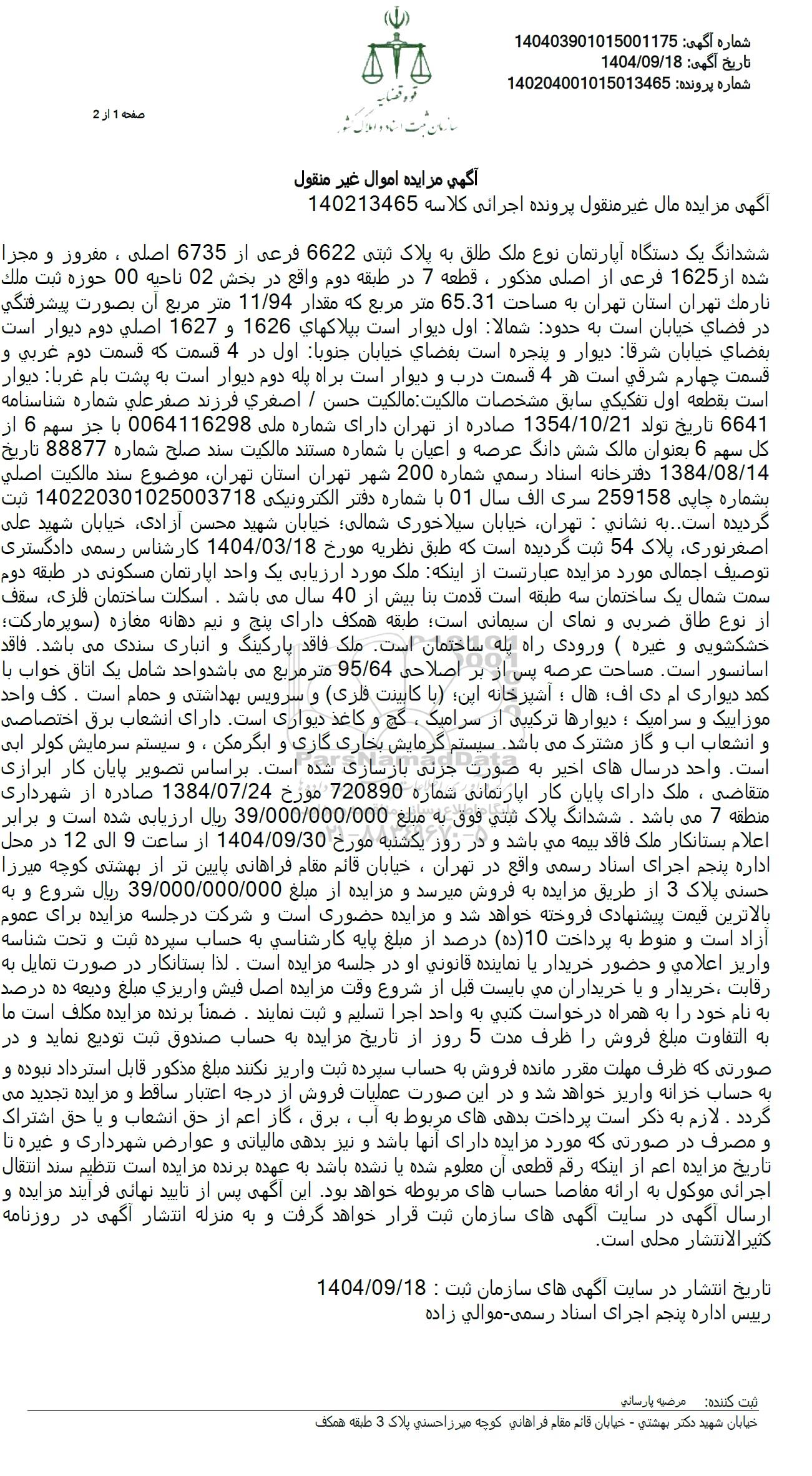 ششدانگ یک دستگاه آپارتمان نوع ملک طلق به پلاک ثبتی 6622 فرعی از 6735 اصلی ، مفروز و مجرا شده از 1625 فرعی از اصلی مذکور، قطعه 7 در طبقه دوم واقع در بخش 02 ناحیه 00 حوزه ثبت ملك نارمک تهران استان تهران به مساحت 65.31 متر مربع که مقدار 11.94 متر مربع آن بصورت پیشرفتگی در فضای خیابان است به حدود شمالا اول دیوار است بپلاکهاي 1626 و 1627 اصلی دوم دیوار است. بقضاي خیابان شرقا دیوار و پنجره است بقضاي خیابان جنوبا اول در 4 قسمت که قسمت دوم غربی و قسمت چهارم شرقی است هر 4 قسمت درب و دیوار است براه پله دوم دیوار است به پشت بام غربا دیوار است بقطعه اول تفكيكي سابق مشخصات مالکيت مالکیت حسن . اصغري فرزند صفر علی شماره شناسنامه 6641 تاریخ تولد 1354.10.21 صادره از تهران دارای شماره ملی 0064116298 با جر سهم 6 از كل سهم 6 بعنوان مالک شش دانگ عرصه و اعیان با شماره مستند مالکیت سند صلح شماره 88877 تاریخ 1384.08.14 دفترخانه اسناد رسمی شماره 200 شهر تهران استان تهران موضوع سند مالكيت اصلي بشماره چایی 259158 سری الف سال 01 با شماره دفتر الکترونیکی 140220301025003718 ثبت گردیده است. به نشانی : تهران خیابان سیلاخوری شمالی خیابان شهید محسن آزادی خیابان شهید علی اصغر نوری، پلاک 54 ثبت گردیده است که طبق نظریه مورخ 1404.03.18 کارشناس رسمی دادگستری توصیف اجمالی مورد مزایده عبارتست از اینکه ملک مورد ارزیابی یک واحد اپارتمان مسکونی در طبقه دوم سمت شمال یک ساختمان سه طبقه است قدمت بنا بیش از 40 سال میباشد. اسکلت ساختمان فلزی سقف از نوع طاق ضربی و نمای آن سیمانی است طبقه همکف دارای پنج و نیم دهانه مغازه سوپر مارکت خشکشویی و غیره ) ورودی راه پله ساختمان است. ملک فاقد پارکینگ و انباری سندی می باشد. فاقد اسانسور است. مساحت عرصه پس از بر اصلاحی 95.64 مترمربع می باشد واحد شامل یک اتاق خواب با کمد دیواری ام دی اف هال : اشپزخانه این با کابینت فلزی و سرویس بهداشتی و حمام است. کف واحد موزاییک و سرامیک : دیوارها ترکیبی از سرامیک، گچ و کاغذ دیواری است. دارای انشعاب برق اختصاصی و انشعاب آب و کار مشترک میباشد. سیستم گرمایش بخاری گازی و ابگرمکن و سیستم سرمایش کولر آبی است. واحد در سالهای اخیر به صورت جزئی بازسازی شده است. بر اساس تصویر پایان کار ابرازی متقاضی ، ملک دارای پایان کار آپارتمانی شماره 720890 مورخ 1384.07.24 صادره از شهرداری منطقه 7 میباشد. ششدانگ پلاک ثبتي فوق به مبلغ 39.000.000.000 ریال ارزیابی شده است و برابر اعلام بستانکار ملک فاقد بیمه میباشد و در روز یکشنبه مورخ 1404.09.30 از ساعت 9 الی 12 در محل اداره پنجم اجرای اسناد رسمی واقع در تهران، خیابان قائم مقام فراهانی پایین تر از بهشتی کوچه میرزا حسنی پلاک 3 از طریق مزایده به فروش میرسد و مزایده از مبلغ 39.000.000.000 ریال شروع و به بالاترین قیمت پیشنهادی فروخته خواهد شد و مزایده حضوری است و شرکت در جلسه مزایده برای عموم آزاد است و منوط به پرداخت (10 ده درصد از مبلغ پایه کارشناسی به حساب سپرده ثبت و تحت شناسه واریز اعلامی و حضور خریدار یا نماینده قانونی او در جلسه مزایده است. لذا بستانکار در صورت تمایل به رقابت خریدار و با خریداران می بایست قبل از شروع وقت مزایده اصل فیش واريزي مبلغ ودیعه ده درصد به نام خود را به همراه درخواست کتبی به واحد اجرا تسلیم و ثبت نمایند. ضمنا برنده مزایده مکلف است ما به التفاوت مبلغ فروش را ظرف مدت 5 روز از تاریخ مزایده به حساب صندوق ثبت تودیع نماید و در صورتی که ظرف مهلت مقرر مانده فروش به حساب سپرده ثبت واریز نکنند مبلغ مذکور قابل استرداد نبوده و به حساب خزانه واریز خواهد شد و در این صورت عملیات فروش از درجه اعتبار ساقط و مزایده تجدید می گردد . لازم به ذکر است پرداخت بدهی های مربوط به آب ، برق ، گاز اعم از حق انشعاب و یا حق اشتراک و مصرف در صورتی که مورد مزایده دارای آنها باشد و نیز بدهی مالیاتی و عوارض شهرداری و غیره تا تاریخ مزایده اعم از اینکه رقم قطعی آن معلوم شده یا نشده باشد به عهده برنده مزایده است تنظیم سند انتقال اجرائی موکول به ارائه م