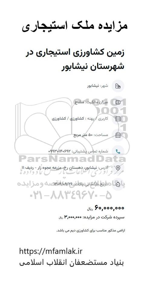 زمین کشاورزی استیجاری در شهرستان نیشابور