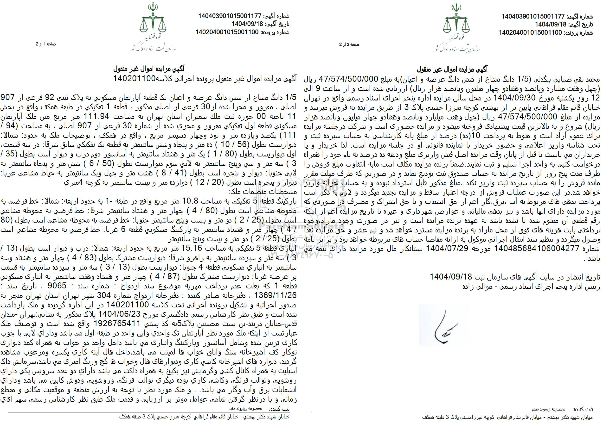 تاریخ انتشار در سایت آگهی های سازمان ثبت 1404.09.18 رئیس اداره پنجم اجرای اسناد رسمی - موالی زاده
