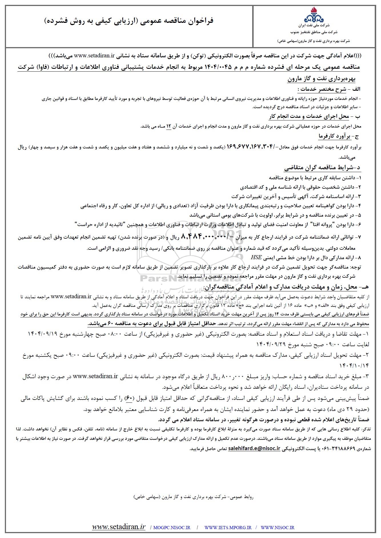 مناقصه عمومی یک مرحله ای فشرده شماره م م م 1404/0045 مربوط به انجام خدمات پشتیبانی فناوری اطلاعات و ارتباطات (فاوا) شرکت بهره برداری نفت و گاز مارون
